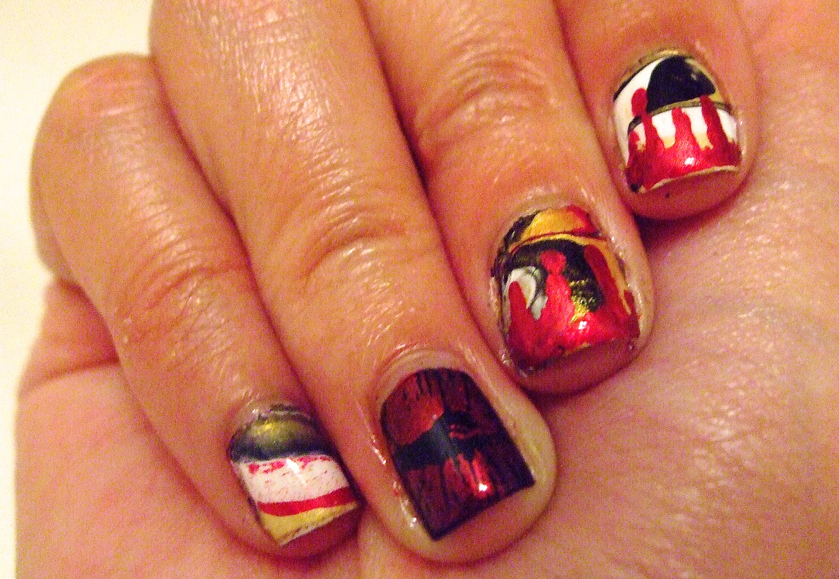 I water-marbled most of my nails and left one accent with a red-lip stamp. I also did a red-drip on the tips.