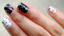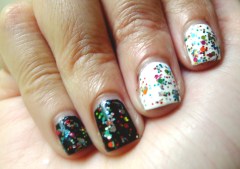 Two coats of Milani’s “Gems” over Essie’s “Blanc” and Wet n Wild’s “Black Crème”. There are more large hex glitters than the smaller counterparts. They are mostly gold or silver with a few colored ones mixed in. The small glitters are blue, pink and purple and very sparse.