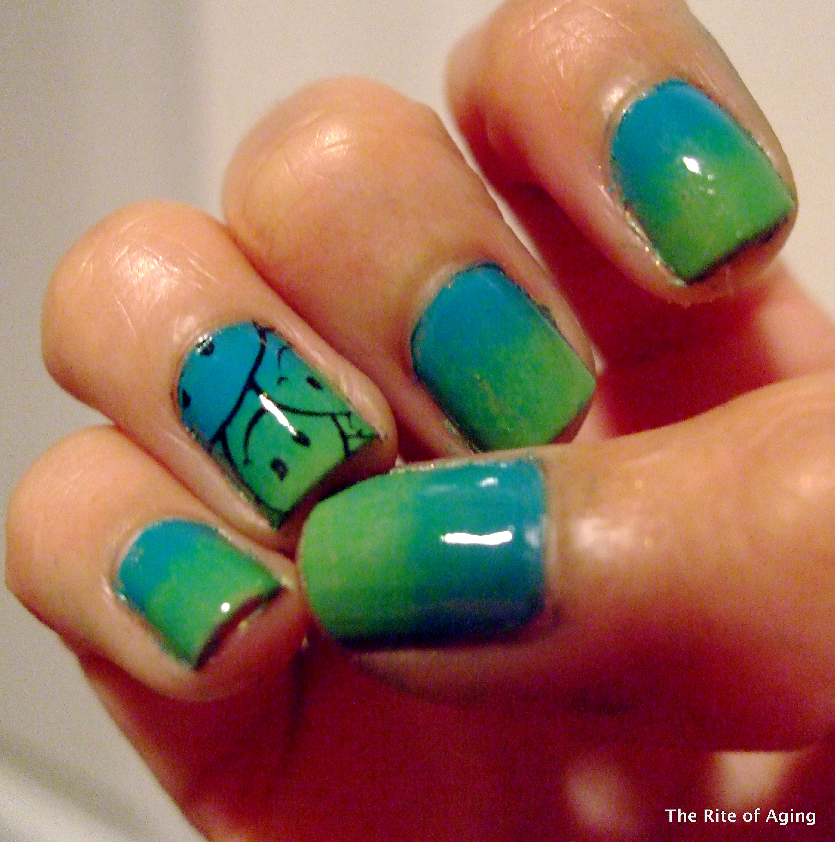 For this nail art, I started with base coat (CND Stickey). I used a sponge gradient method to apply Milani’s “Mint Chip” and Milani High Speed Fast Dry’s “Quick Teal”. For the stamping I used Bundle Monsters’ plate “BM 304”. EDIT: Racking my brains I realized that I had used “Mint Chip” which is a light green creme instead of “Peacock”. I should probably start writing these things down so I don’t forget!