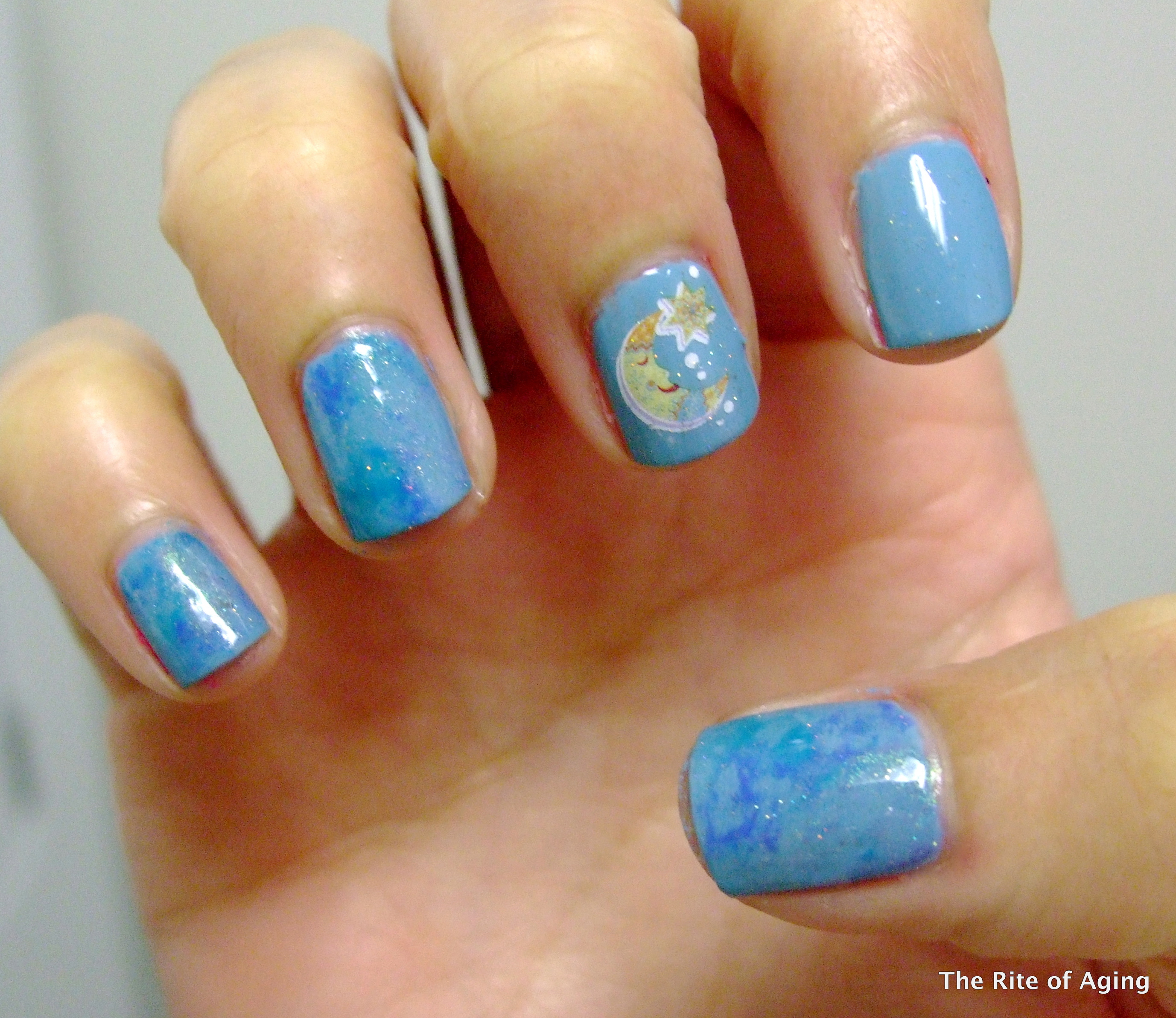 I started with a generous coat of Seche Vite to protect the base. I alternated Milani “Quick Teal”, Urban Outfitters “Blue Velvet”, Chanel Le Vernis “Pearl Drop”, and a little Zoya “Adina”. I went really heavy on the nail polish remover because I did not want any harsh lines.