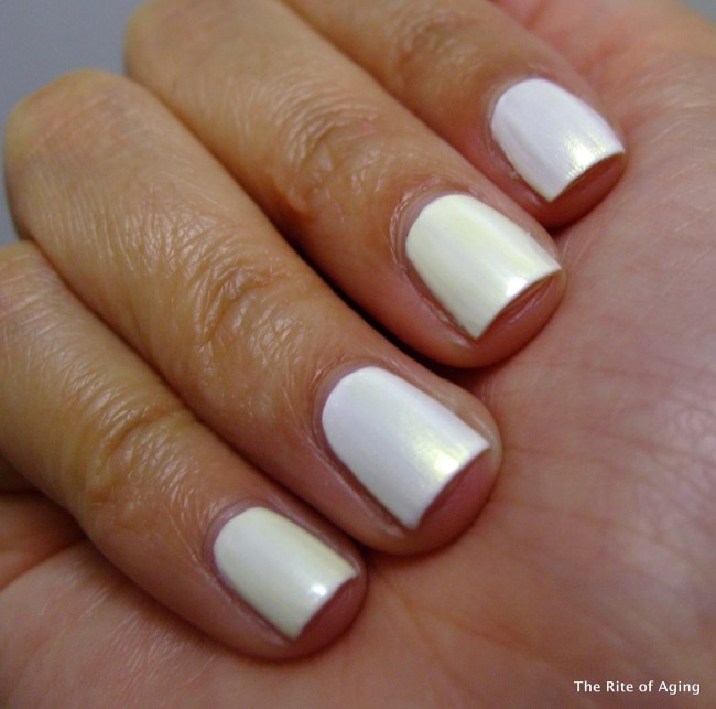 As with most Chanel polishes, it is on the thick side and streaky on it’s own. A sheer coat over another color eliminates the streakiness, though. Over white, it really resembles the look of a white pearl, however, by itself, it is more yellow!