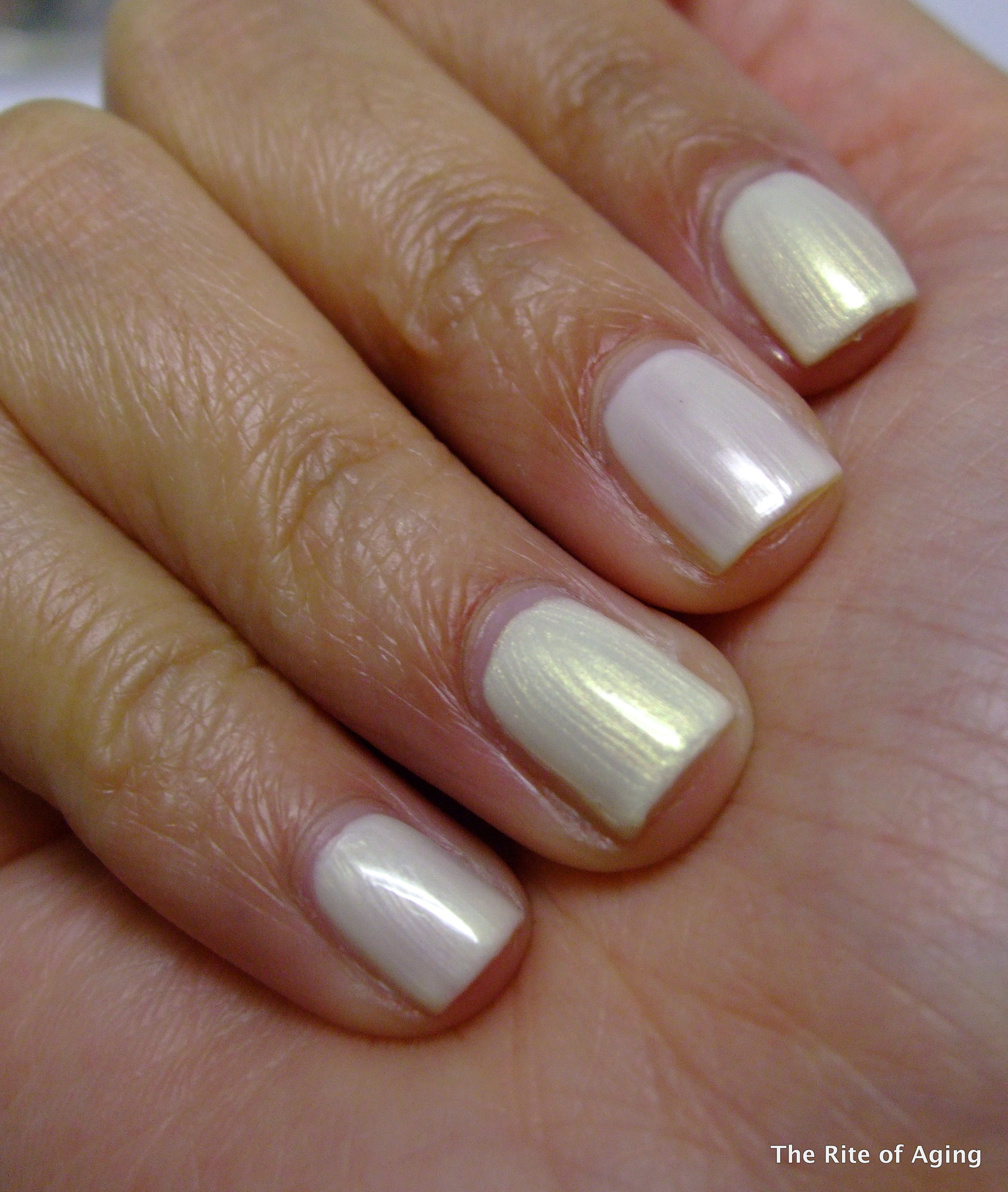 As with most Chanel polishes, it is on the thick side and streaky on it’s own. A sheer coat over another color eliminates the streakiness, though. Over white, it really resembles the look of a white pearl, however, by itself, it is more yellow!
