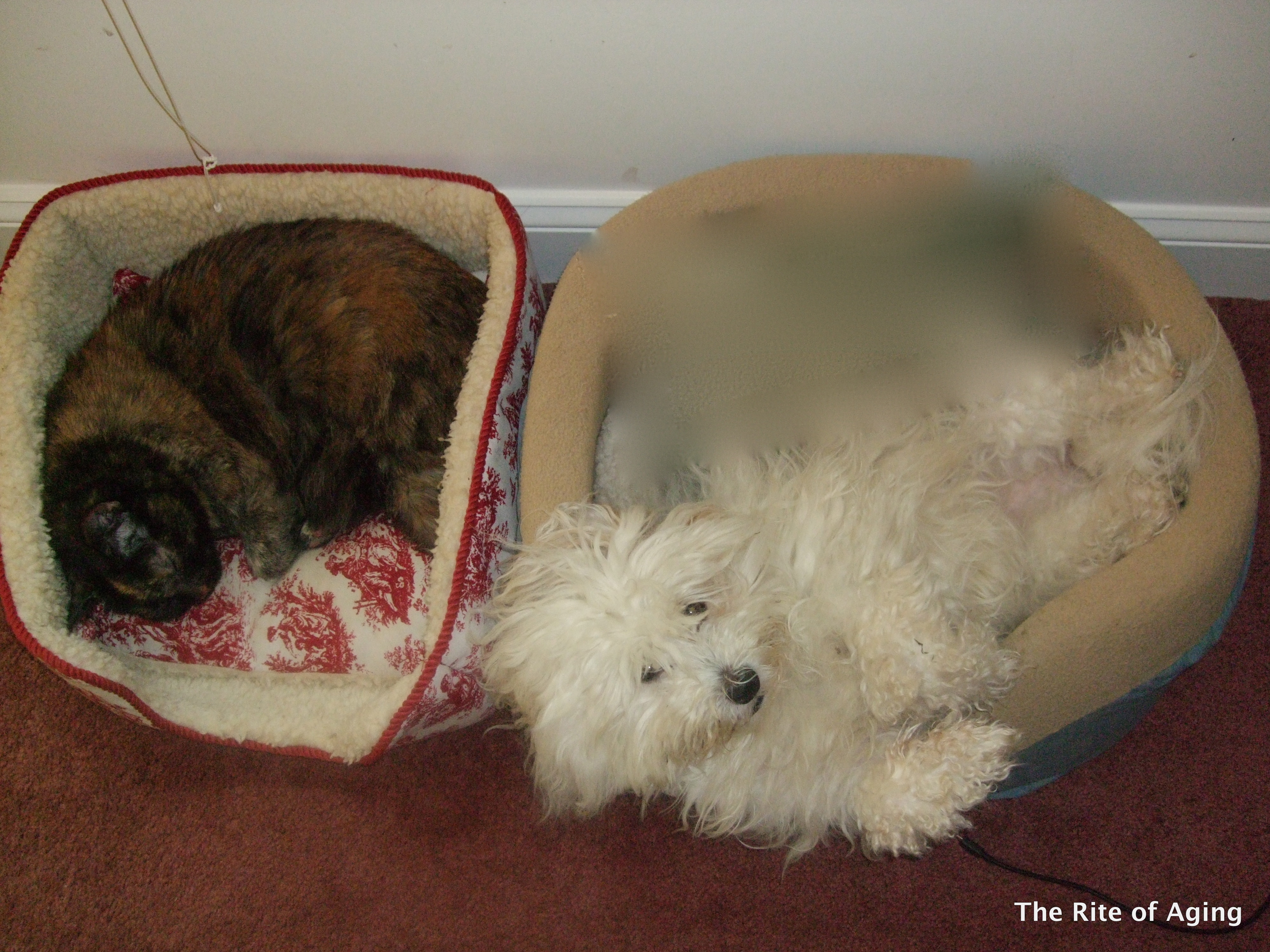 About a month ago, Affie followed Sunsilk and me into the bathroom. Sunsilk was urinating in the litter box (thankfully!) and Affie tried to crawl in with her.