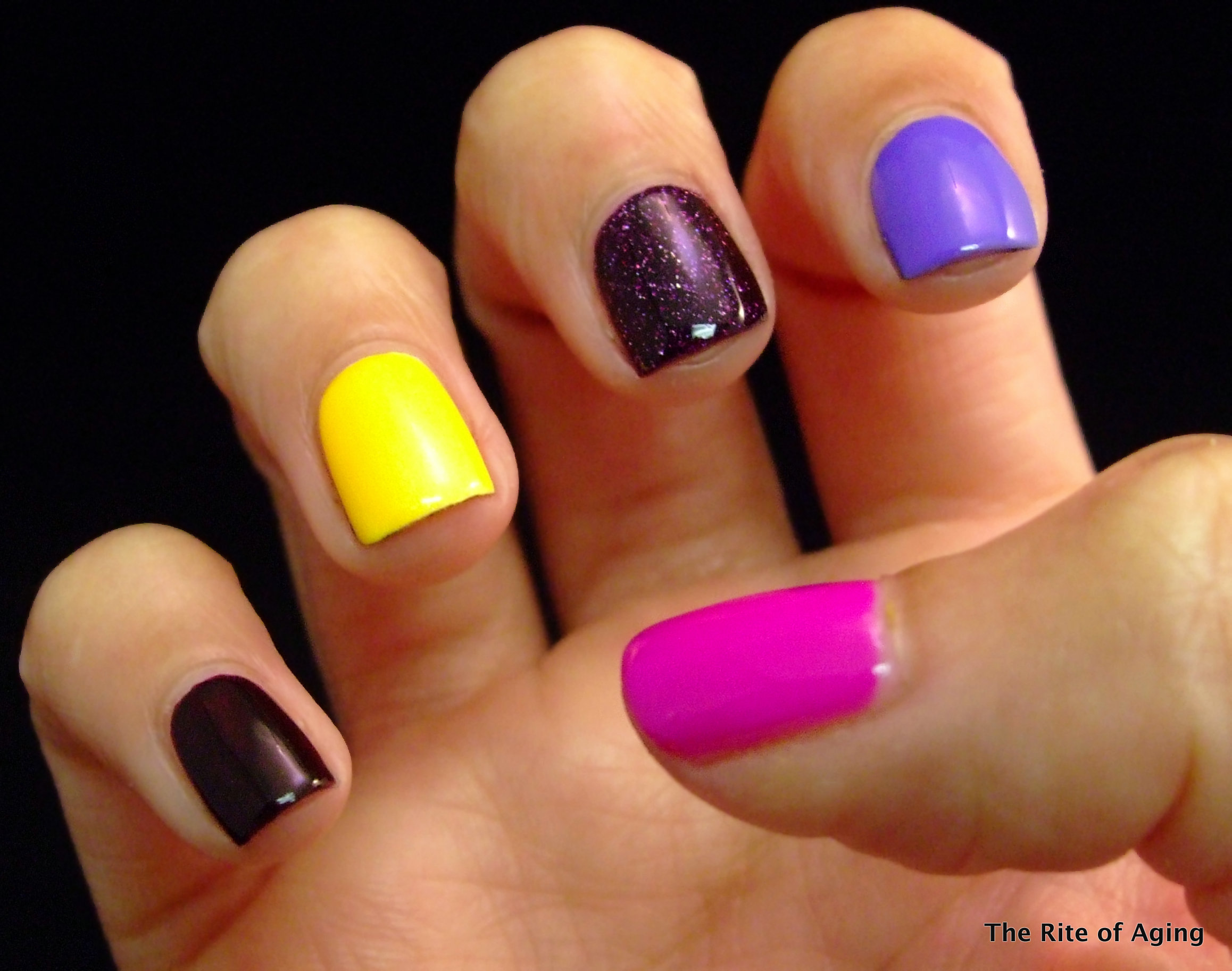 I rarely do non pattern skittle manicures unless it is an Ombre-style. I tried to push myself out of my comfort zone for this challenge but somehow ended up in the same color category!! I thought the bright yellow worked well with the other purples. That counts, right??