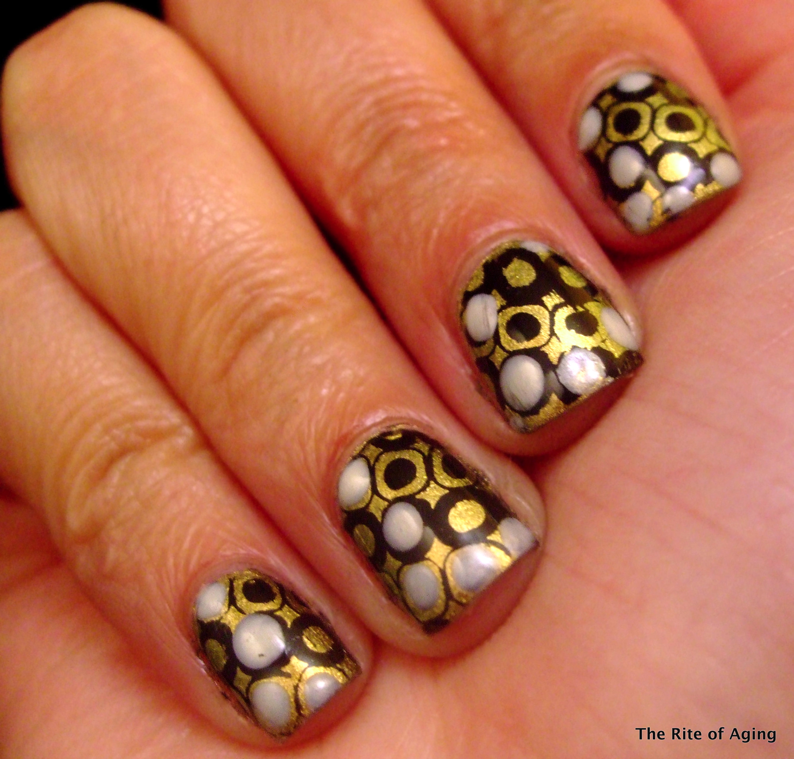 I hope you like my submission for the second week of June’s NAIL. I could not get the stamp to transfer properly! I tried it a couple of times and I used my “pearl” drops to mask the poor stamping…hehehe.