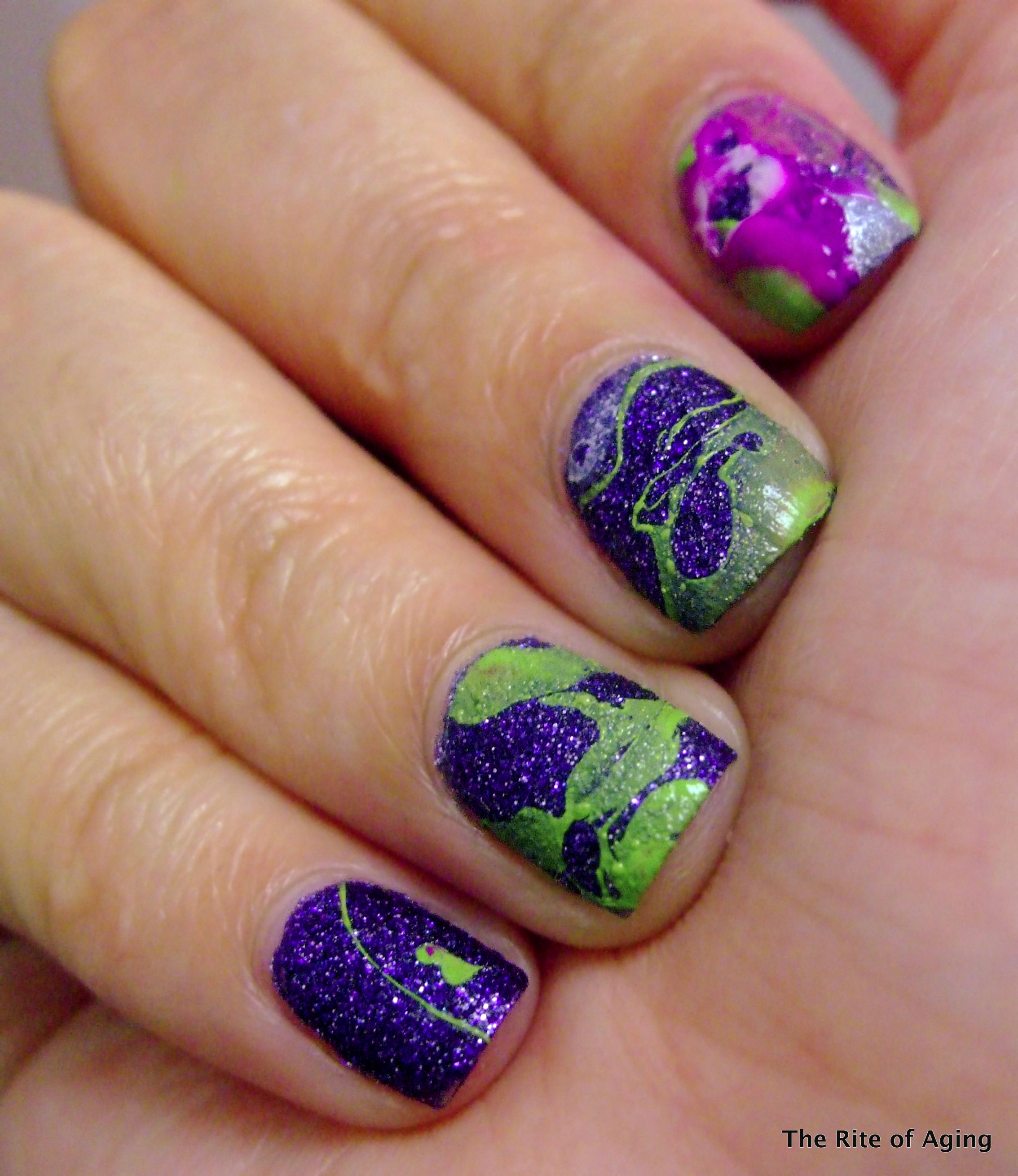 I water-spotted with Color Club Mrs. Robinson, Formula X by Sephora Thrilling and Sephora by OPI It’s Totally Karma.