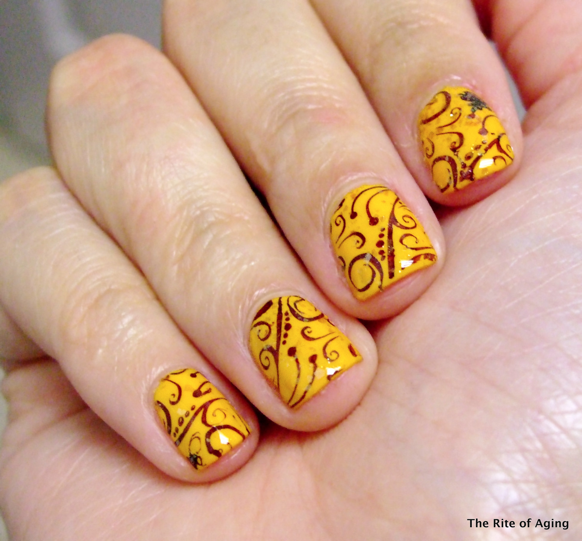 I marbled without the water-marble with Zoya Maria Luisa. I don’t think the concentration would have varied that much if I applied the topper straight from the bottle (especially over the yellow base) but the technique is just so satisfying!
