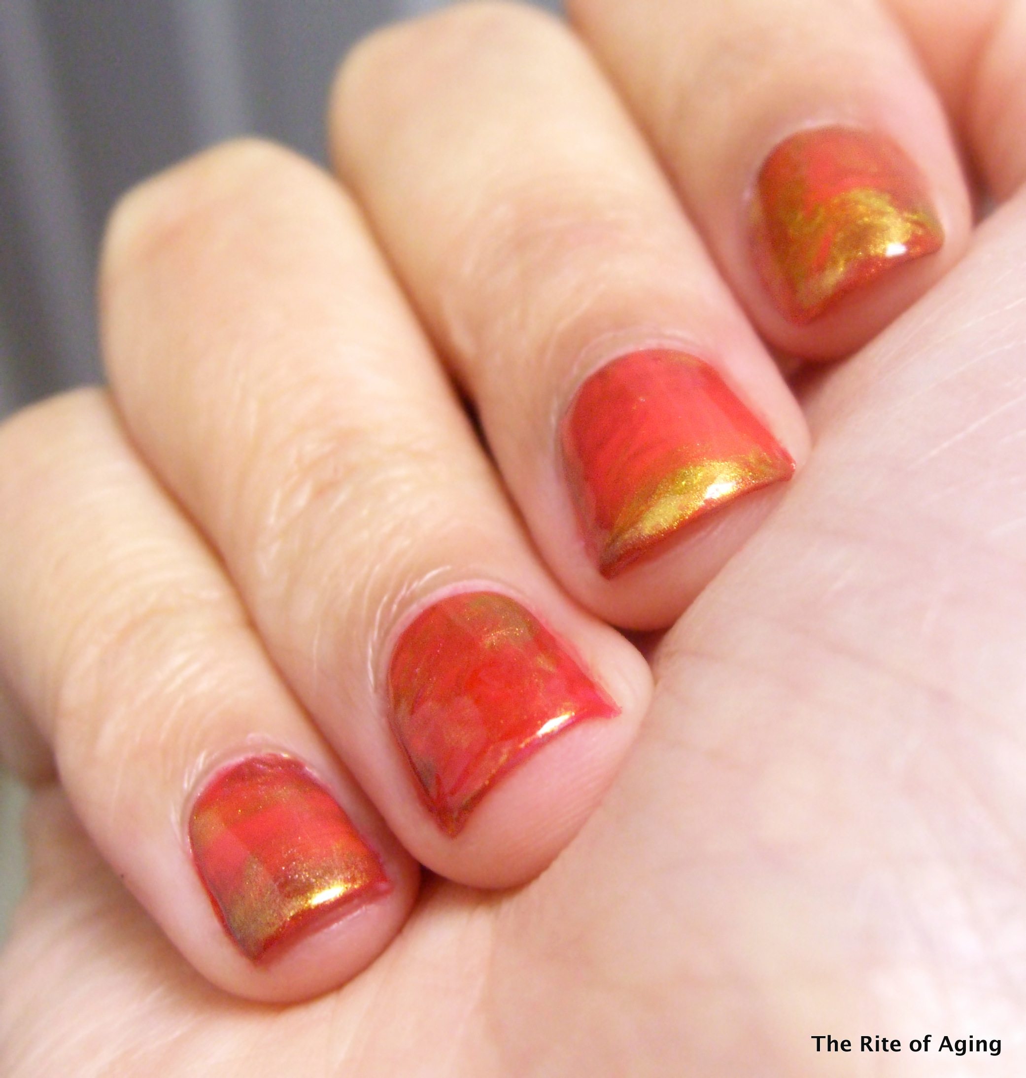 I marbled with Wet n Wild, OPI Red Lights Ahead…Where?, Essie No Place Like Chrome, Zoya Goldie, and Barry M Gelly Chili.
