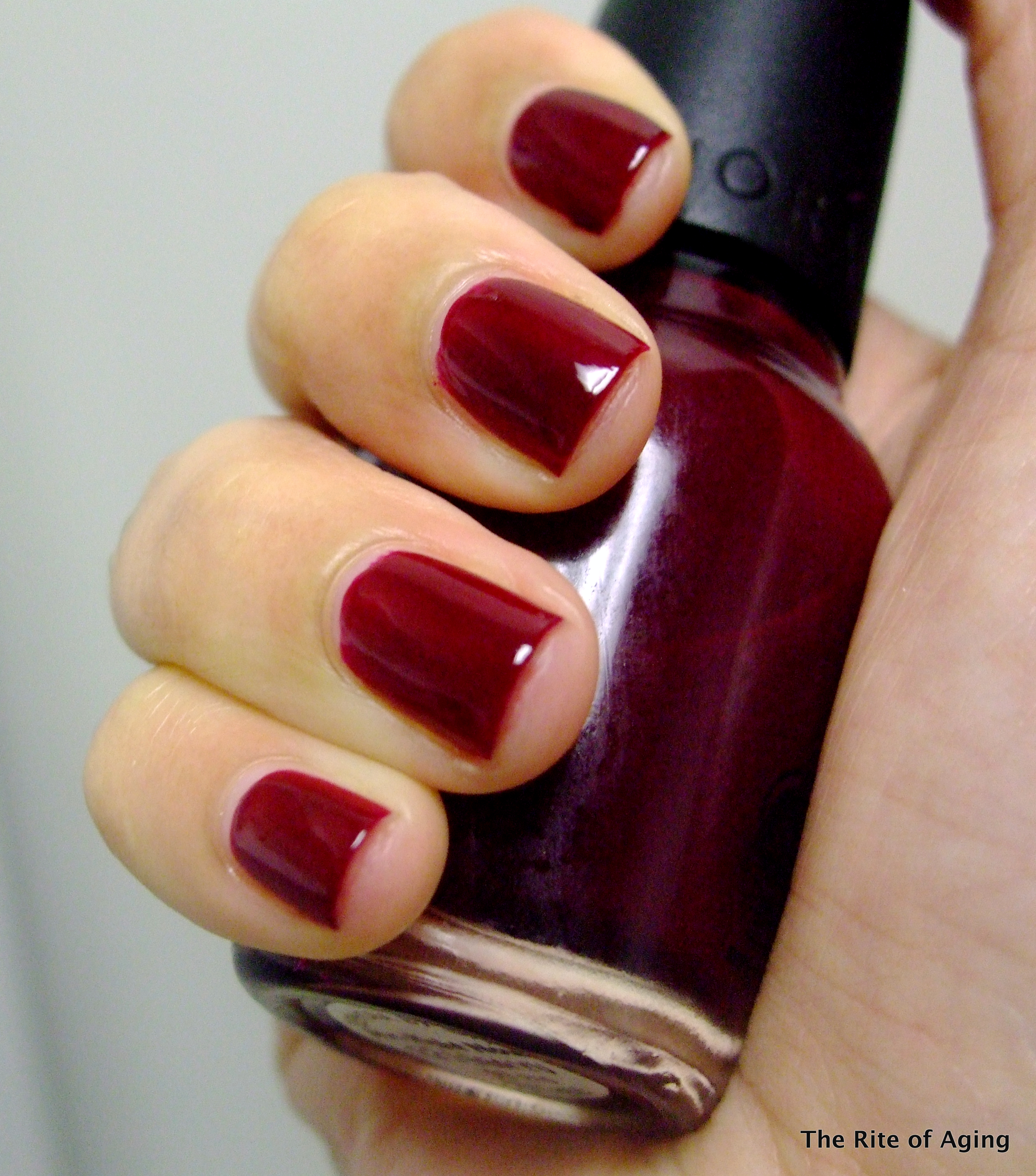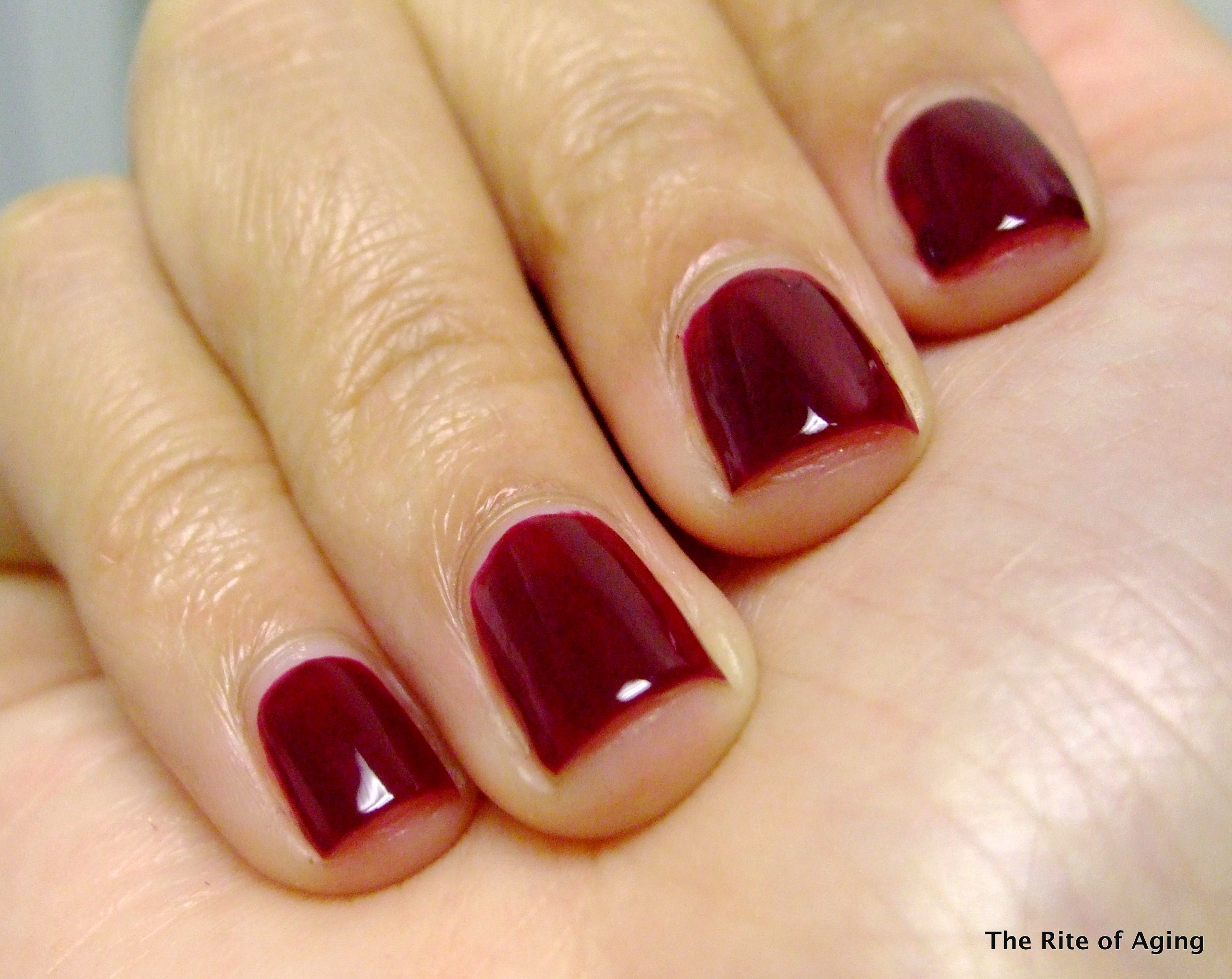 This is a great dark red. The formula is neither thin nor runny, however, when I apply it to the nail it streaks. Luckily, it dries to an even jelly finish.