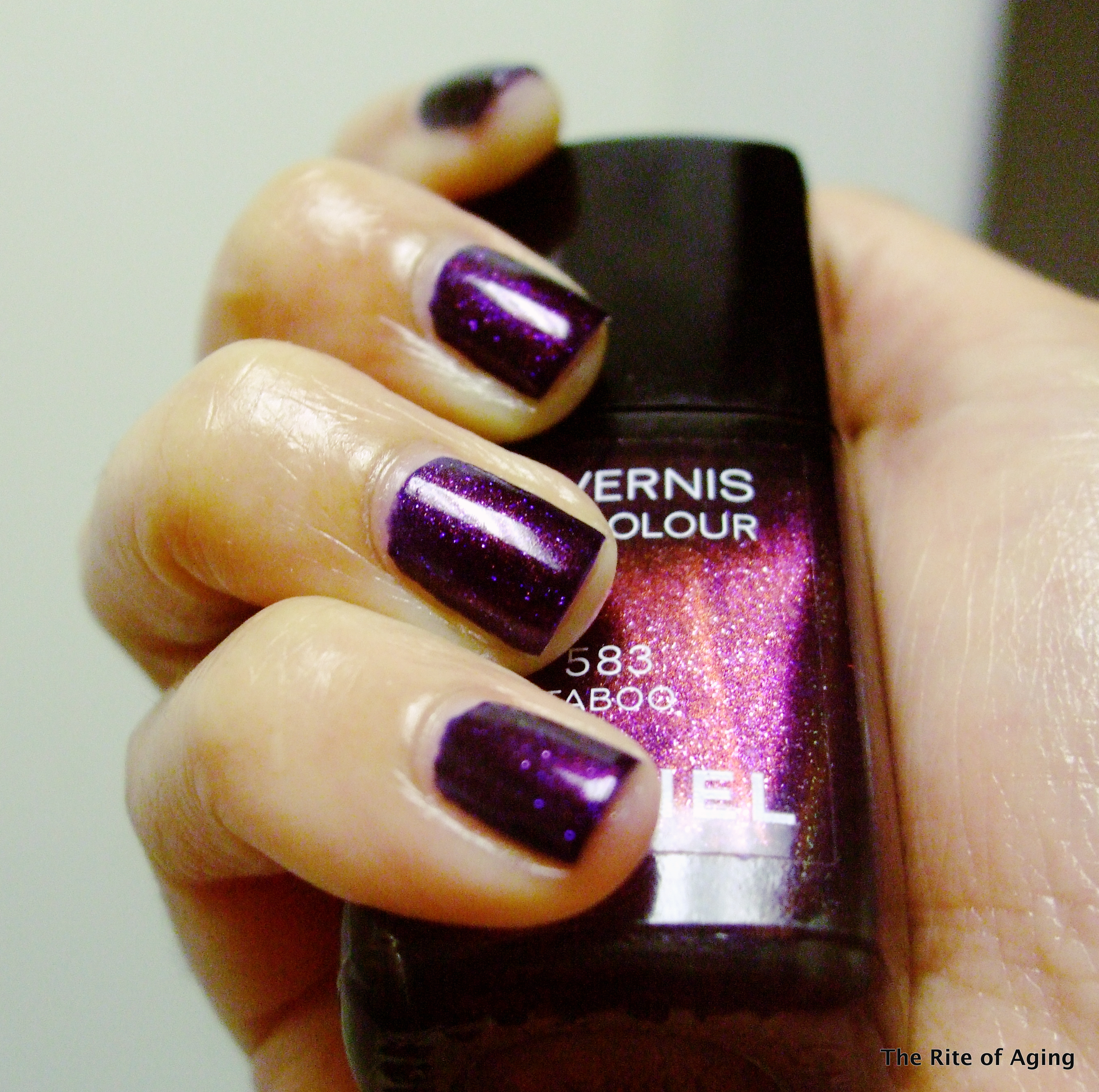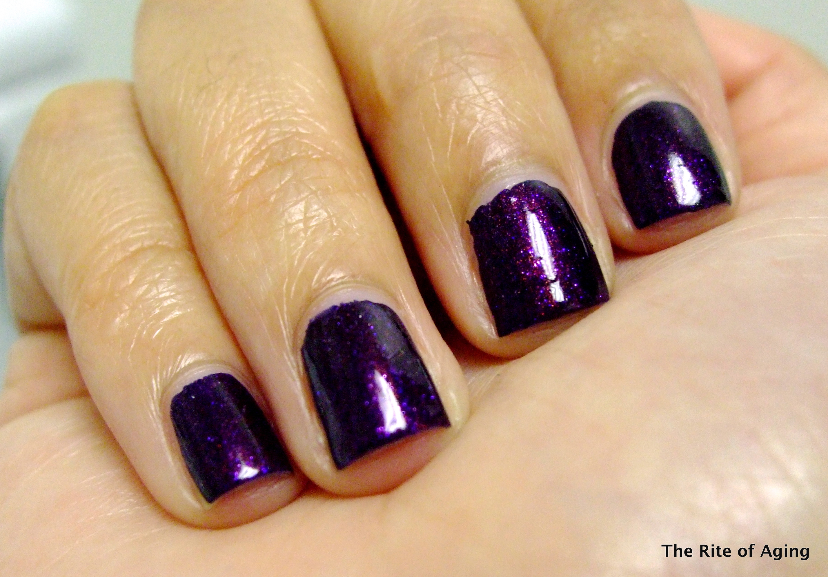 This is a highly pigmented deep royal purple with red, purple and gold shimmer. In the bottle it appears purple with red shimmer or red with gold shimmer. Unfortunately, the red and gold combination does not transfer to the nail.