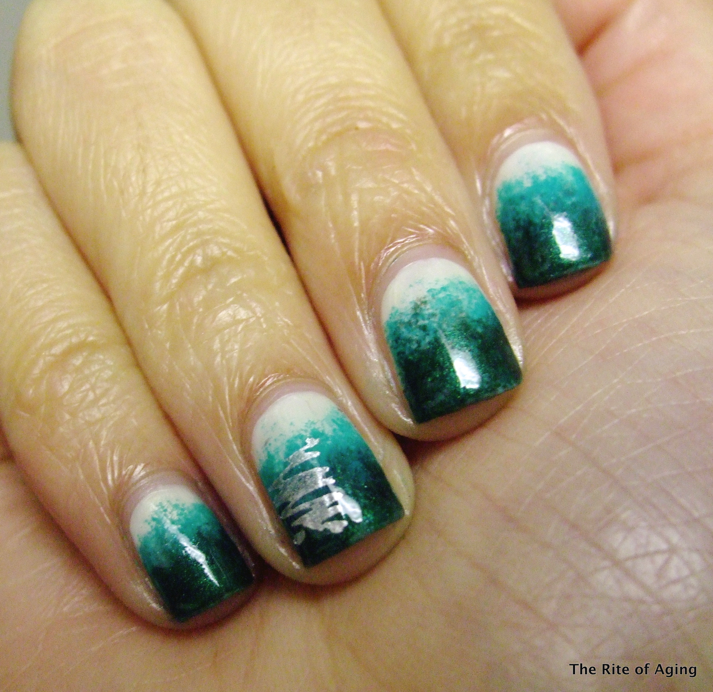 Once the base coat and base color dried I tore three small pieces from a foundation sponge and, with a pair of tweezers, sponged the SpaRitual, Zoya, and butter London polishes in diagonals across the nail.