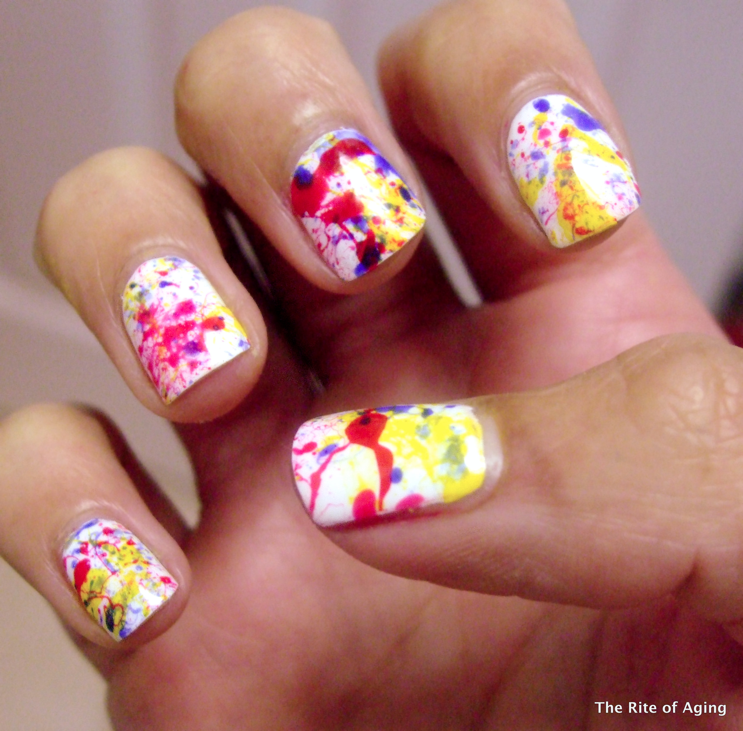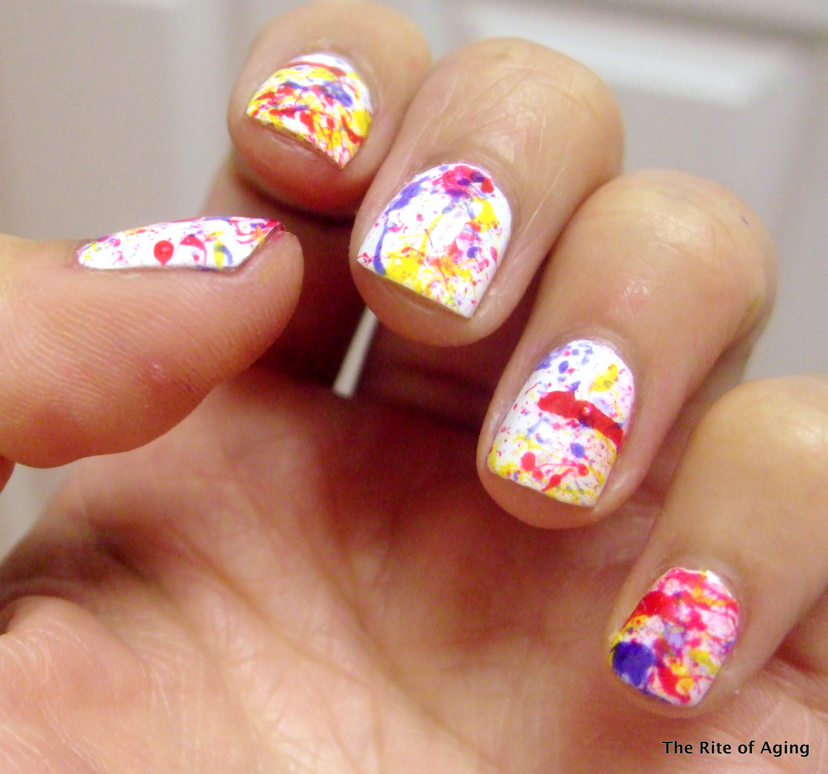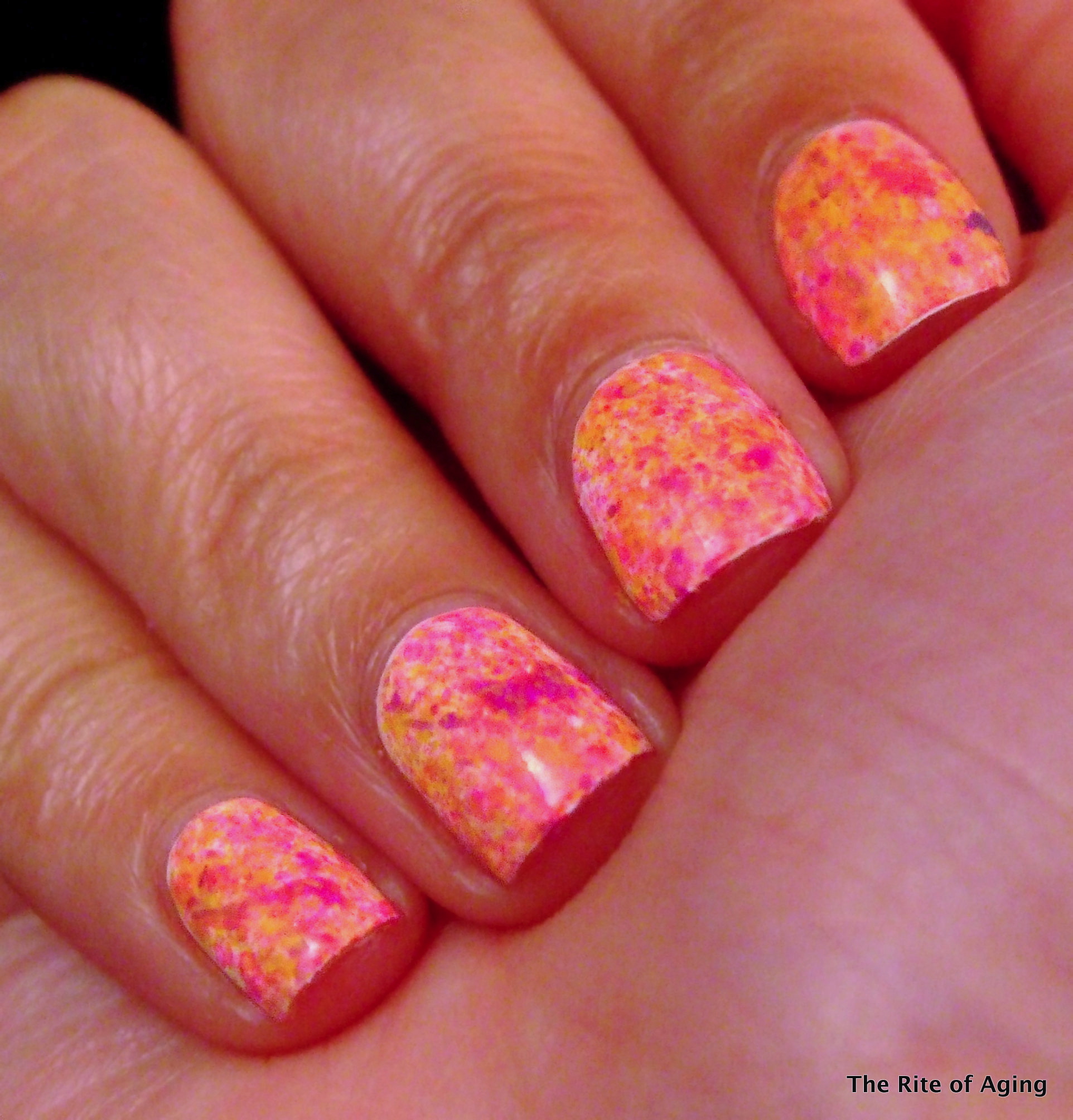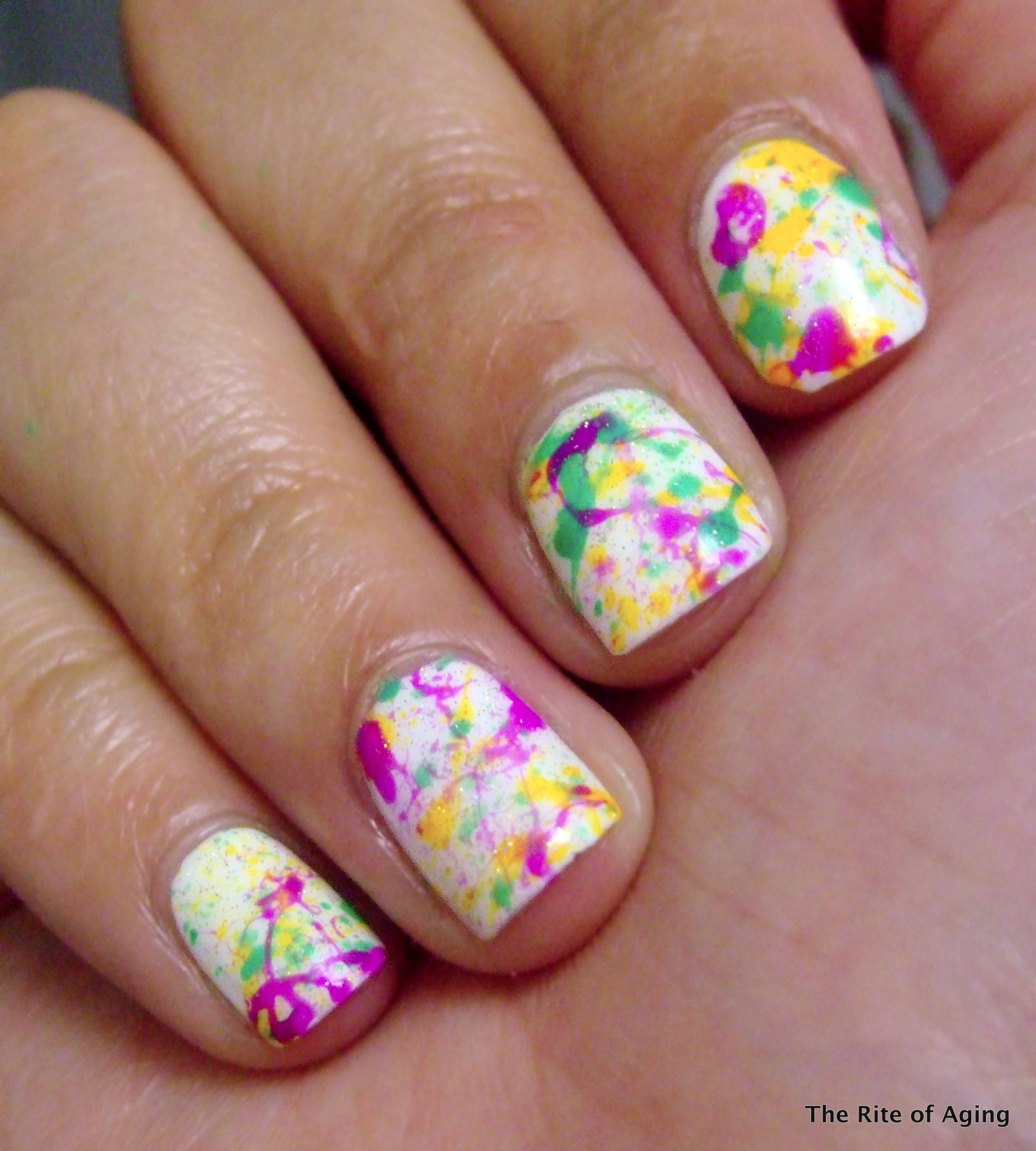 I splattered with separate straws and China Glaze Sun Worshipper, In the Lime Light and Color Club Mrs. Robinson.